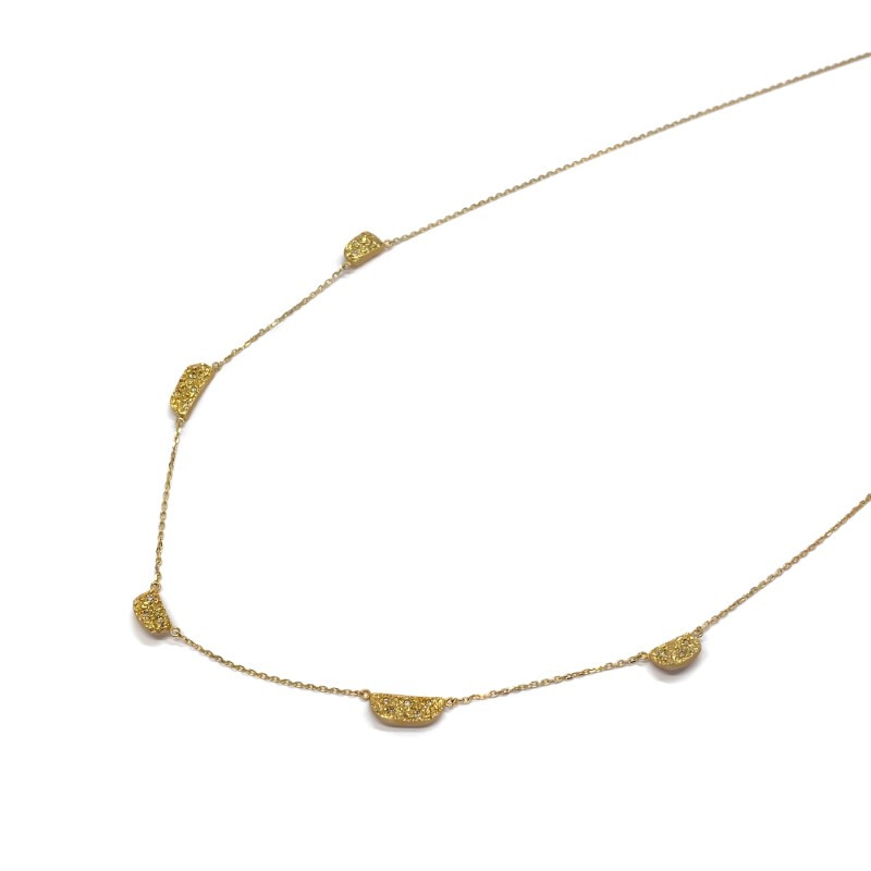 メノウの断面にインスパイアされた有機的なフォルムのデザインパーツを繊細なチェーンに5つ配置しました。ちりばめられたメレダイヤが光を受けて美しく煌めきます。