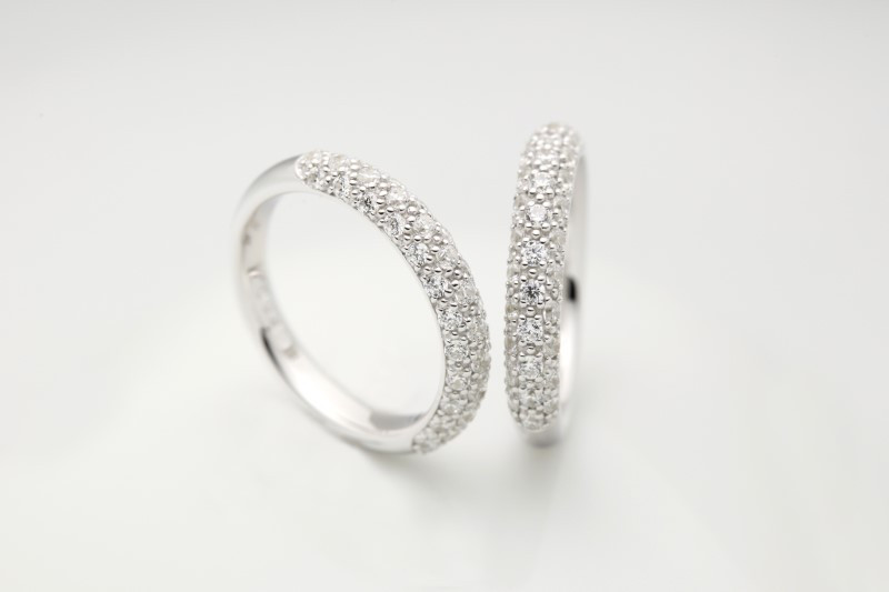 甲丸の形状にしっかりとダイヤを均等に留めるのは、職人の技術の差が出ます。完成度高く仕上げているので、引っ掛かりなどを気にせずに安心してお使いいただけます。