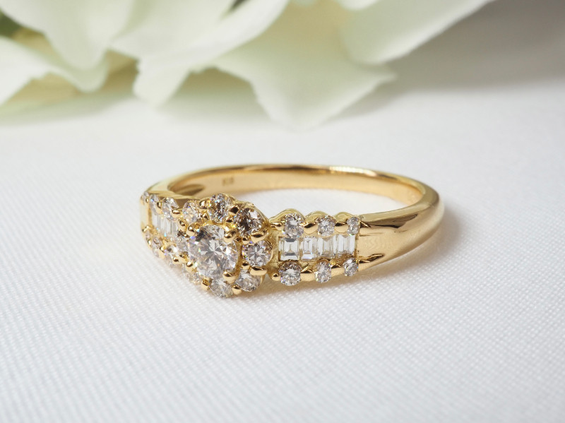 大人のフラワーリング < 甲府ジュエリー >K18YG 0.50ctバゲット&ラウンドフラワーダイヤモンドリング9201 【サイズ:8号~18号 ※0.5号刻み】