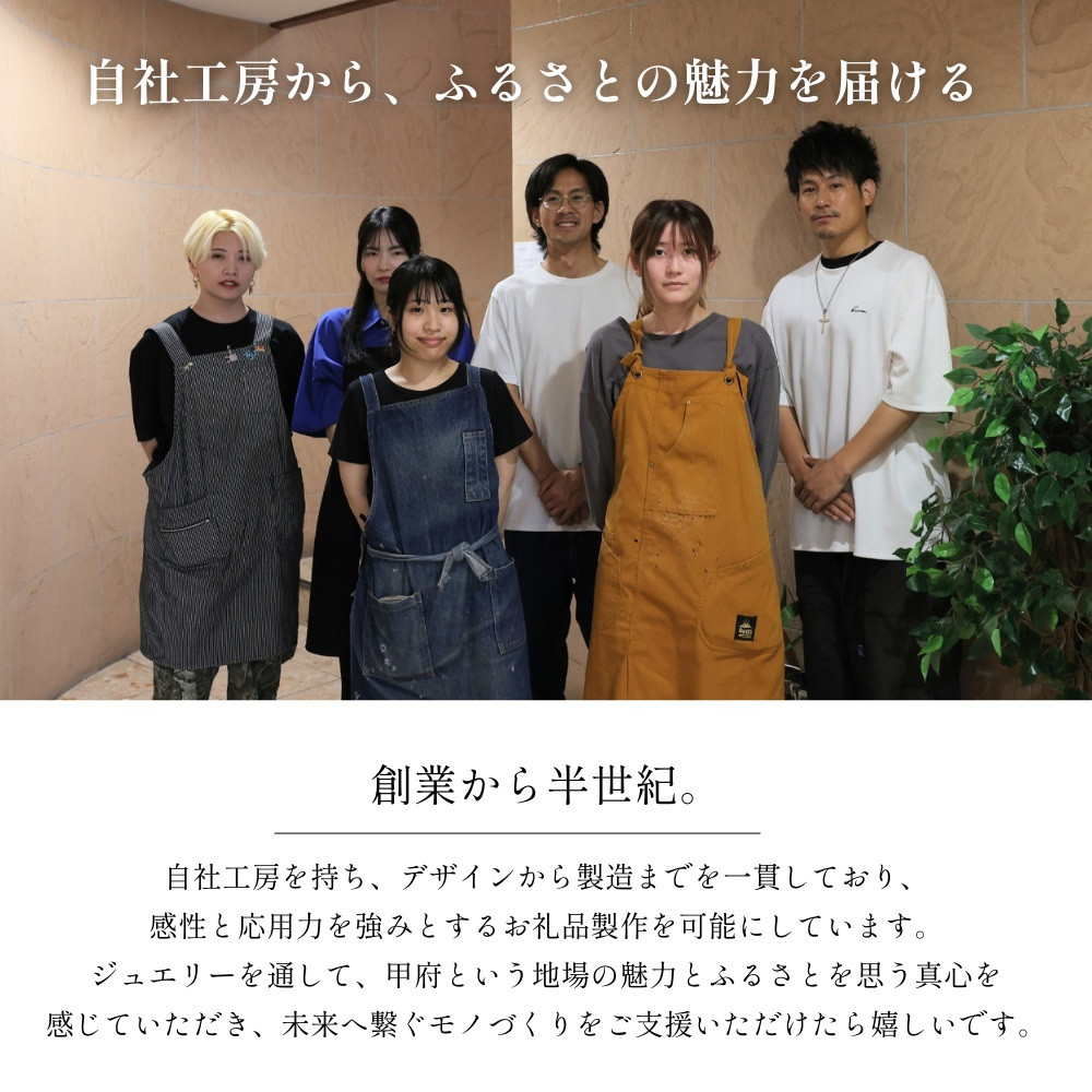 古来、水晶産地であったことがきっかけで、宝石の研磨、貴金属加工、水晶美術彫刻の技術が発達し、世界的にも珍しい宝飾品の集積産地であり、「宝石のまち甲府」とも言われています。400年以上伝わる甲州印伝も受け継がれ続けており、職人の技術が光る特産品が数多くあります。