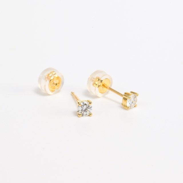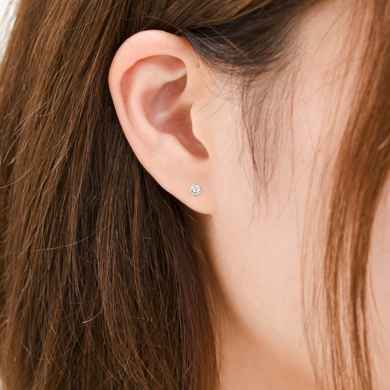 ・ペアでトータル0.2ctupの大粒ダイヤモンドを4本爪タイプで仕上げました。すっきりした印象を与えつつ、ダイヤモンドが隠れる面積が少ないのでやや大きく見えるところもポイントです。お仕事、お出かけ、普段使いと、どのようなシーンでもピタリとハマるのが魅力のスタッドピアスが、2石とも希少なDカラーでペア組みされています。凛とした輝きの無色透明カラーをぜひともお楽しみください。
