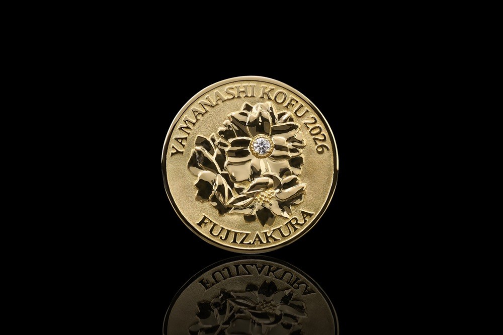 山梨県の県花でもある富士桜(フジザクラ)をモチーフにしたK18ゴールドメダル。