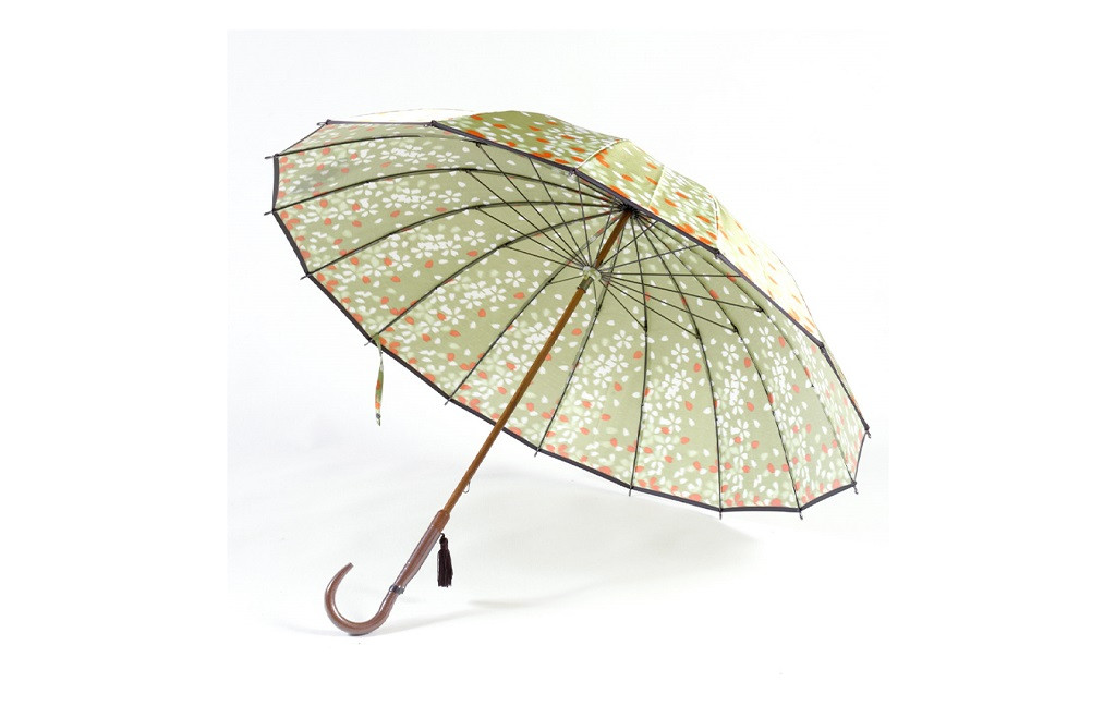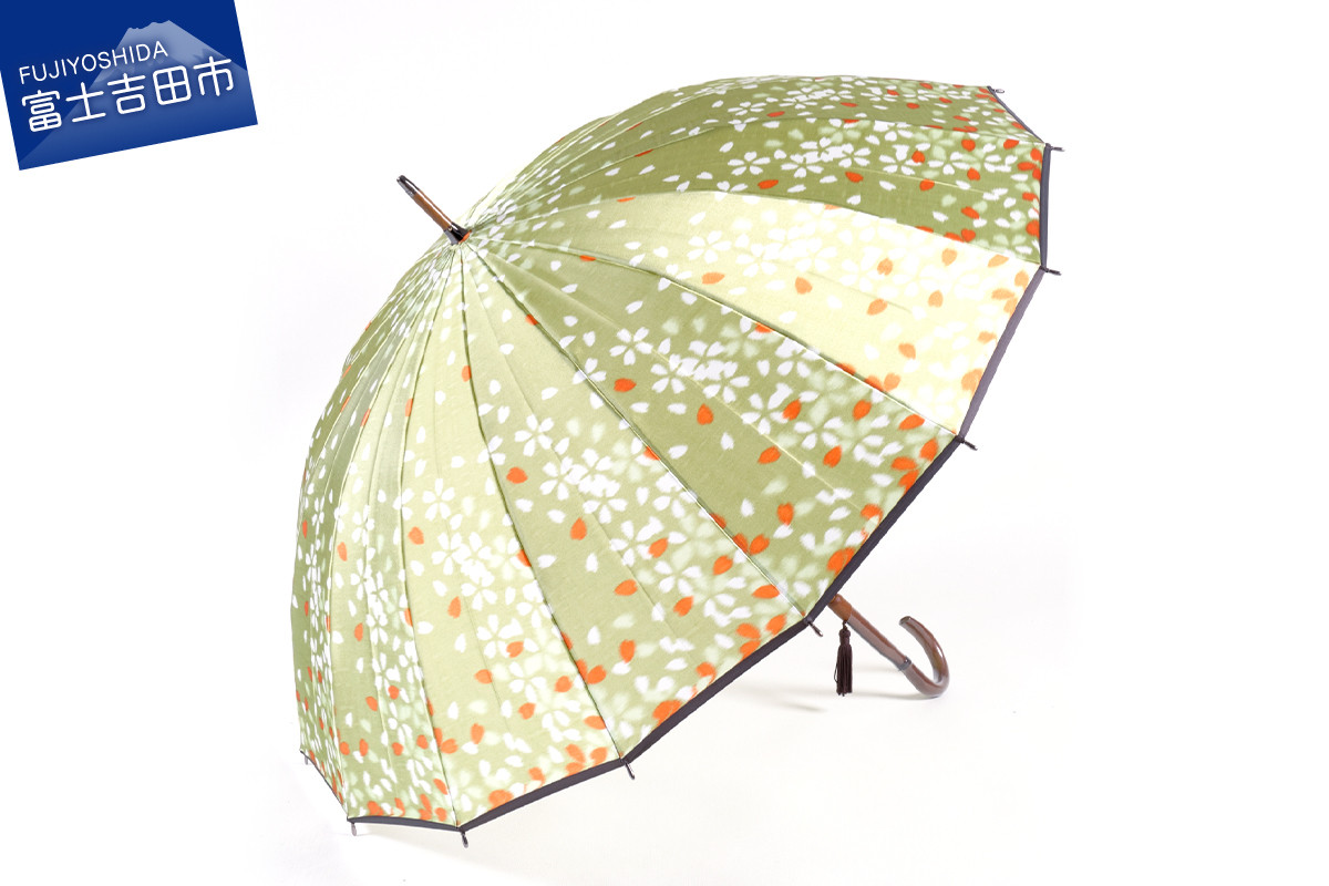 高級雨傘「桜吹雪」緑色 傘 高級 長傘 16本骨 カーボン 桜吹雪柄 緑色 グリーン 日傘 防水 撥水 山梨 富士吉田