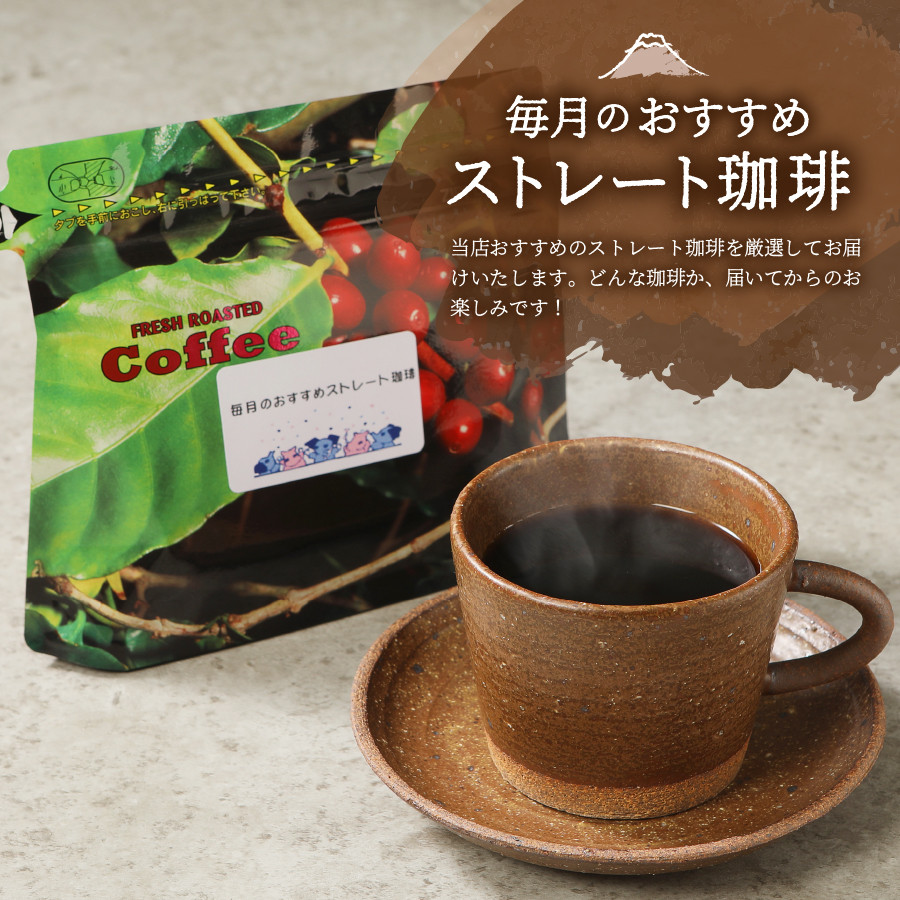 さわやかな味の富士五湖ぶれんど、香りの良いふじやまぶれんど、苦味の効いた樹海ぶれんど、そして毎月お薦めのストレートコーヒーと、芳醇な香味の珈琲詰め合せになっています。