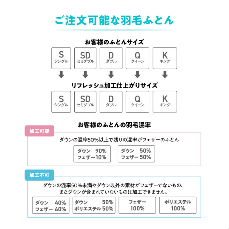 ・リフレッシュ加工キット到着後、できるだけ速やかに羽毛ふとんをお送りください。