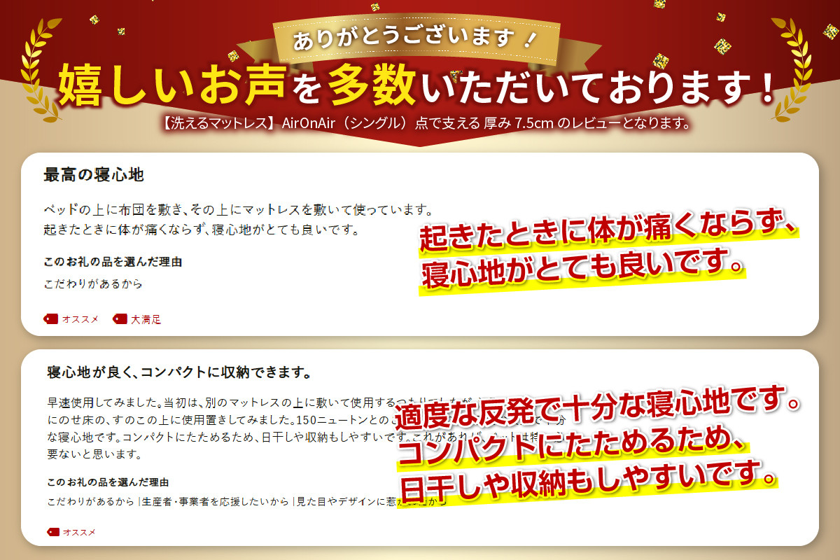 もっと自由なマットレス AirOnAirシリーズ 【洗えるマットレス】AirOnAir(シングル)点で支える 厚み7.5cm シングルマット 寝具 シングル マットレス AirOnAir 洗える 山梨 富士吉田