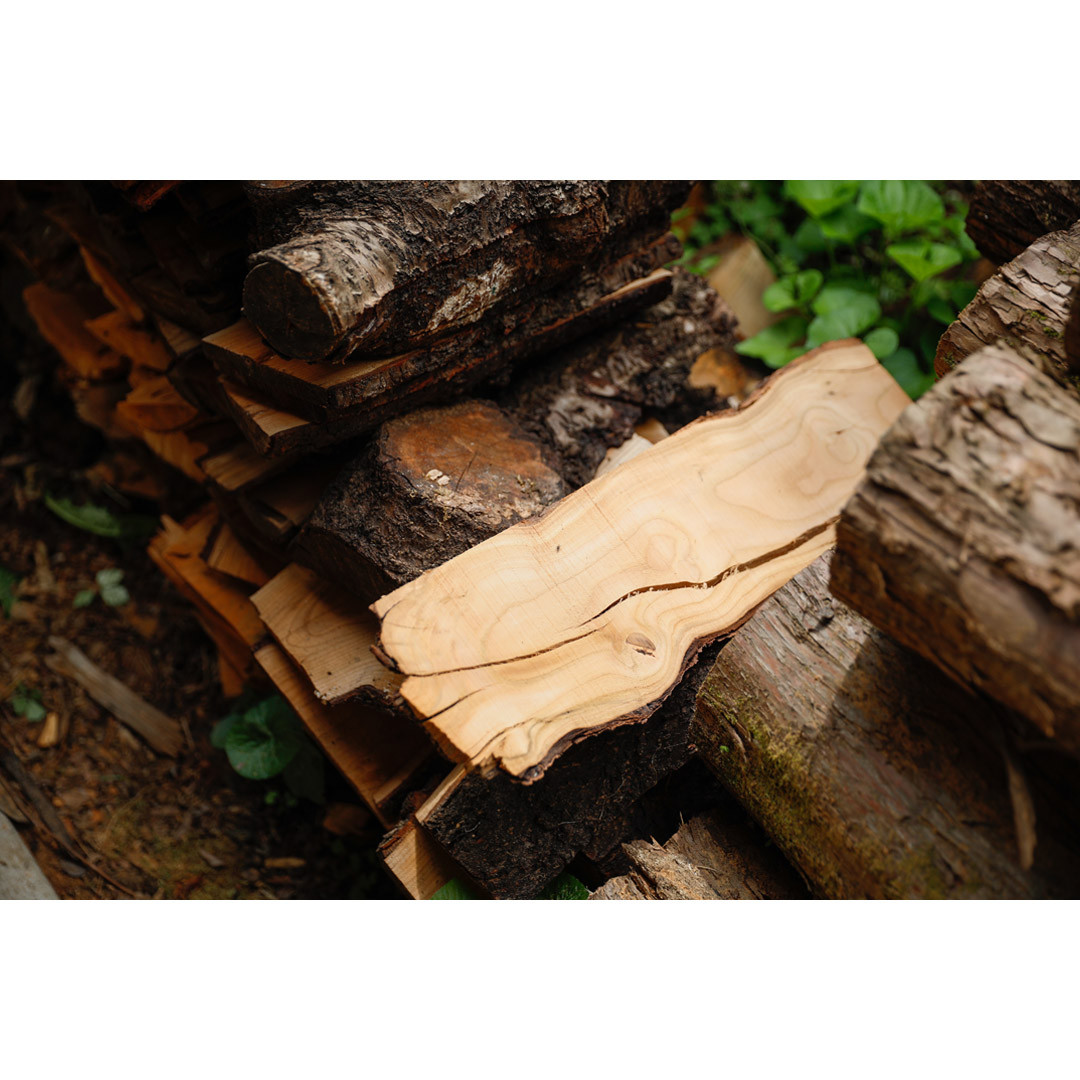この地に生き、これらの木に育てられた自身を振り返ると、果樹の生産を終えた木々がそのまま廃棄される現実を悲しく、切なく感じました。また、新たな使命として使い道を模索していたところ、寄木などの手法を用いた製品化に行き着きました。