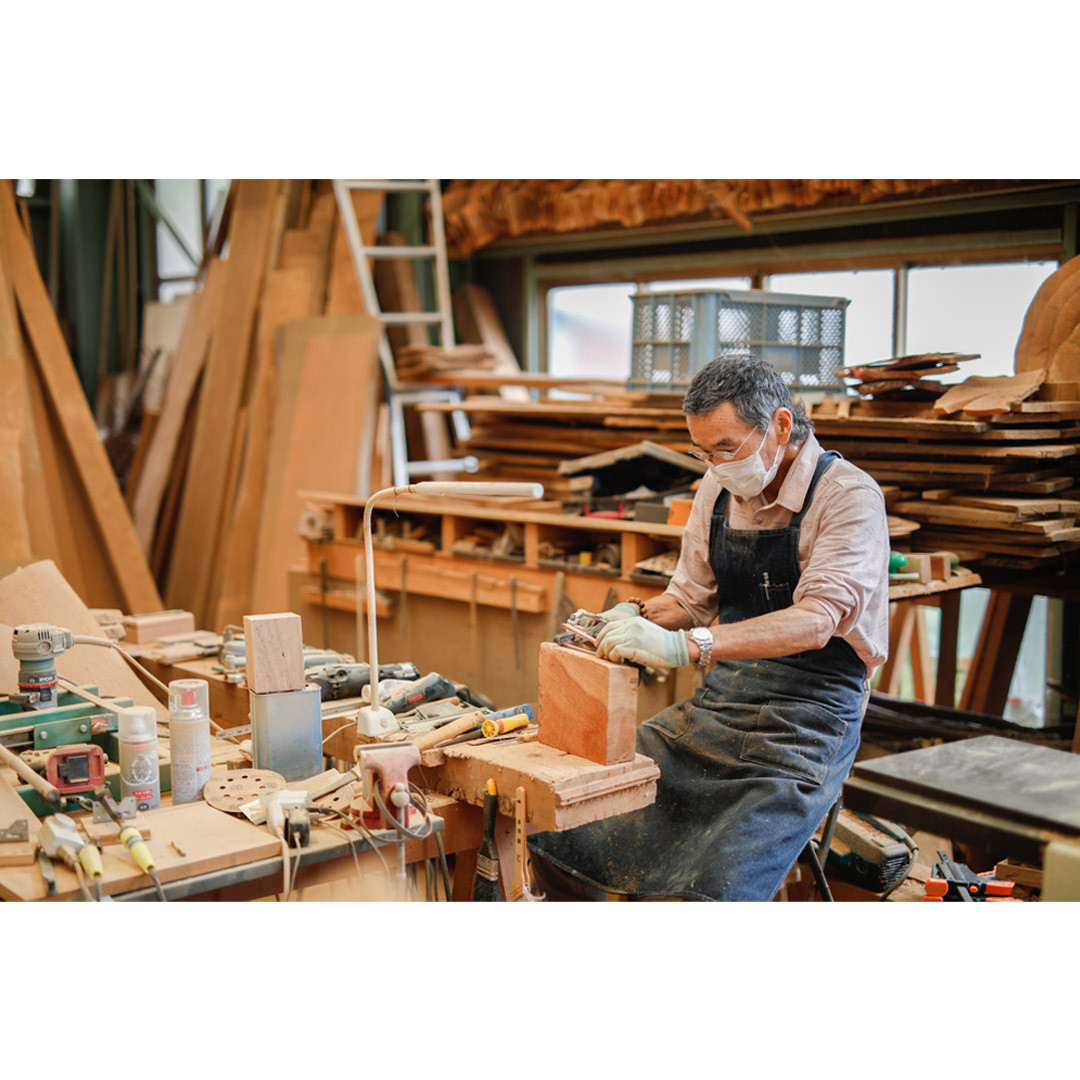 アーティストって少し重いなと思いますが、そんな思いで製品づくりに携わっています。現職は工房の製作主ですが、この富士吉田市に生まれ、中学時代から大工としての修行を行いました。
