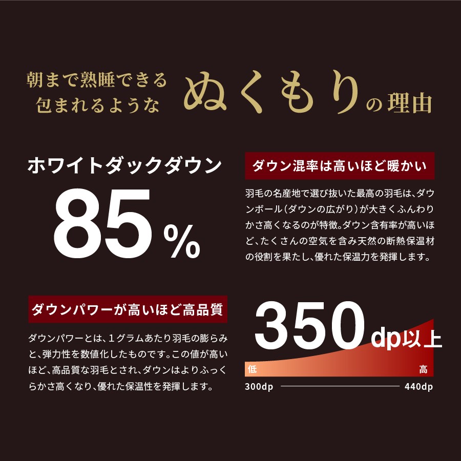 ホワイトダックダウン85%フェザー15%の上質な羽毛を400g充填致しました。