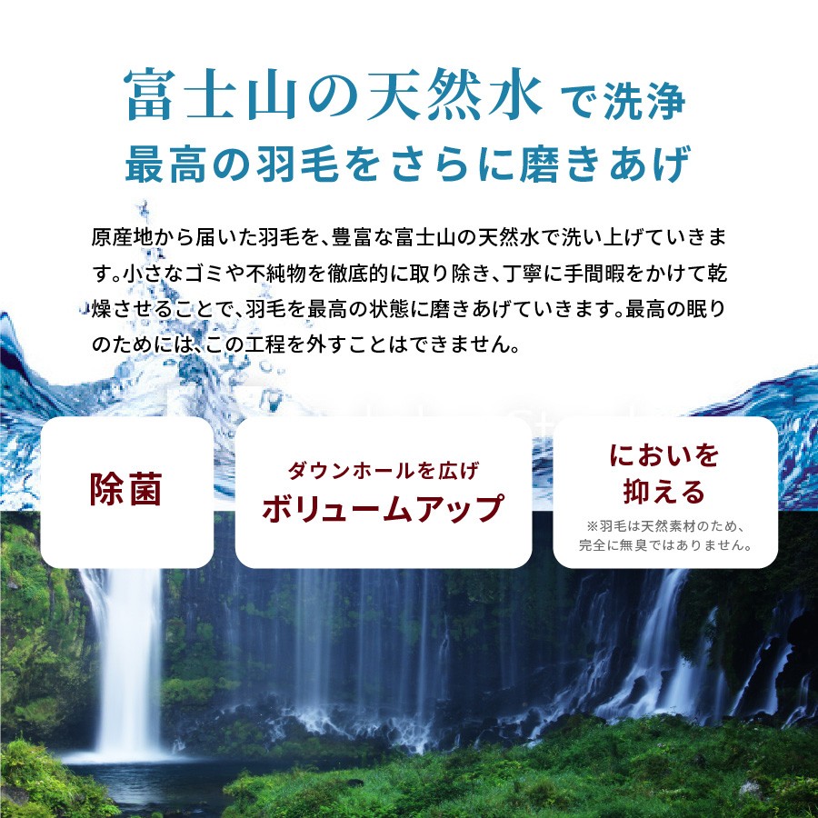 富士山麓の天然水で丁寧に洗い上げた、贅沢羽毛で贅沢な眠りをお楽しみください