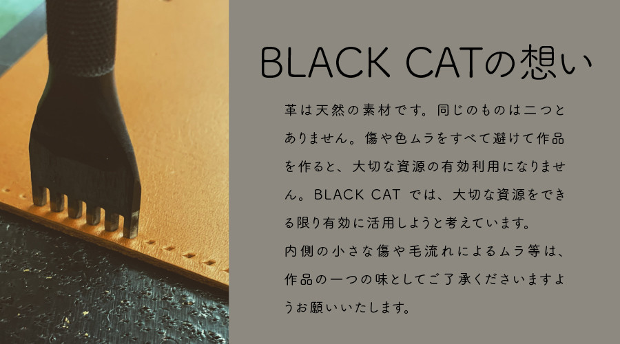 BLACK CATでは、素材そのものの魅力を最大限に引き出すことを大切にしています。レザーは様々な種類を使用していますが、経年変化も楽しめるものもあります。完成品の美しさだけでなく、長く使い続けたくなるような“暮らしに馴染む一点”を目指して制作しています。