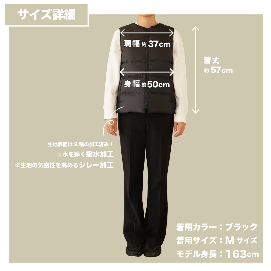 | 容量 | ダウンベスト(薄手)レディース×1着 【カラー】全6カラー:ブラック・キャメル・ネイビー・ピンク・グラスグリーン・レッド 【サイズ・外寸(cm)】M:着丈約57、肩幅約37、身幅約50 【素材】表地:ポリエステル100%(撥水・シレー加工)裏地:ポリエステル100% 【詰物】ホワイトダウン ダウン90% フェザー10% |