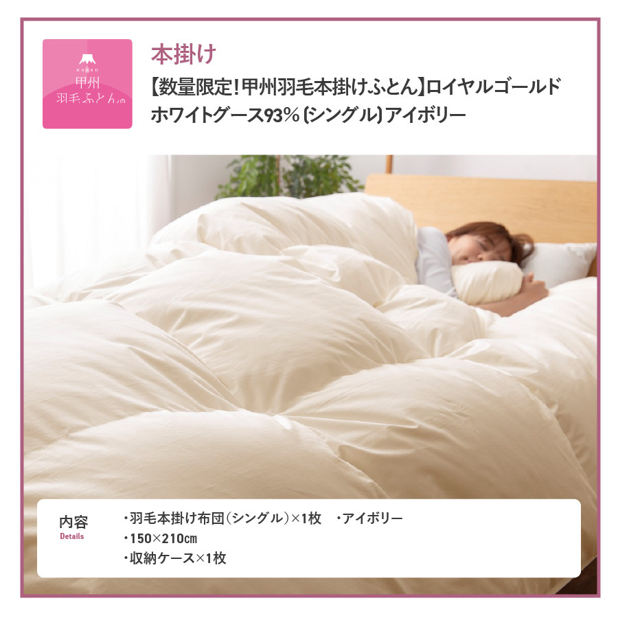 【今だけ限定】「ロイヤルゴールド」ホワイトグース防ダニ羽毛布団 【数量限定!甲州羽毛本掛けふとん】【選べる配送時期】 布団 ロイヤルゴールドホワイトグース93% (シングル) アイボリー 寝具 掛け布団 シングル 掛けふとん 本掛け布団 回収キット付き 山梨 富士吉田
