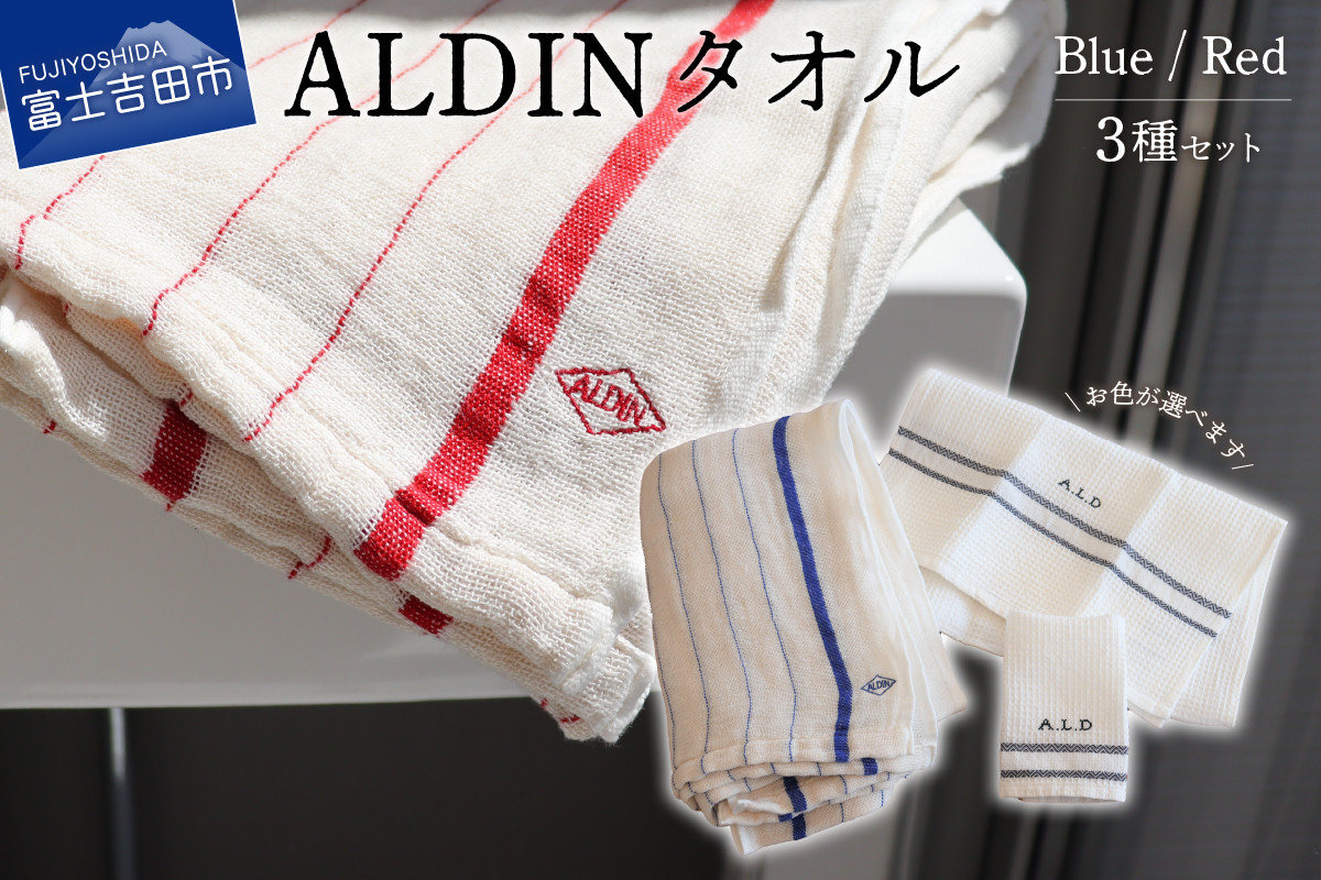 生地の企画・縫製・刺繍まですべて手作業で作られたタオルを3枚セットでお届け! 【手作業限定生産】 アルディン製タオル3種類のセット ハンドタオル フェイスタオル Wガーゼ バスタオル ワッフル素材 携帯に便利 山梨 富士吉田