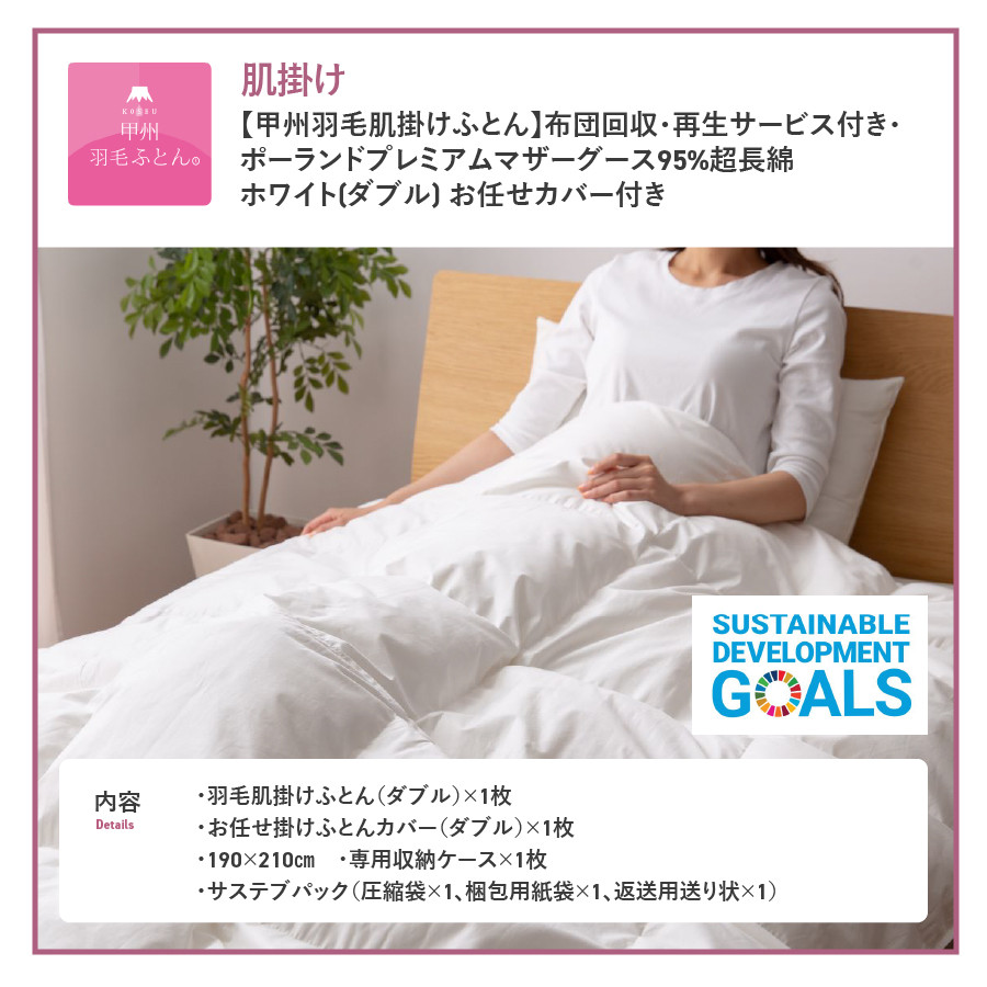 布団回収・再生サービス付き・世界遺産「富士山」の麓で作られた羽毛ふとん。 【甲州羽毛肌掛けふとん】布団回収・再生サービス付き・ポーランドプレミアムマザーグース95%超長綿 ホワイト (ダブル) お任せカバー付き 羽毛布団 寝具 掛けふとん 布団 掛布団 富士吉田 山梨