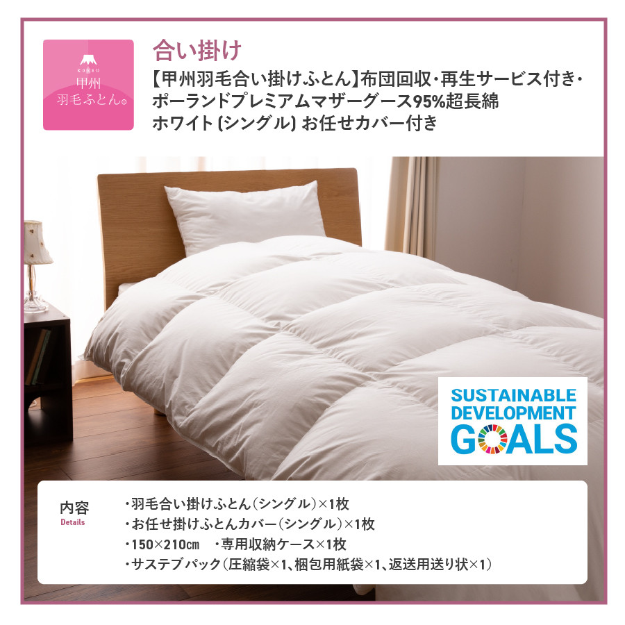 布団回収・再生サービス付き・世界遺産「富士山」の麓で作られた羽毛ふとん。 【甲州羽毛合い掛けふとん】布団回収・再生サービス付き・ポーランドプレミアムマザーグース95%超長綿 ホワイト (シングル) お任せカバー付き 羽毛布団 寝具 掛けふとん 布団 掛布団 富士吉田 山梨