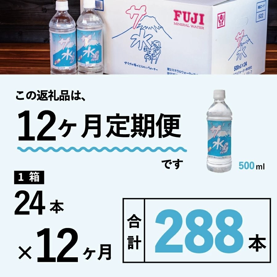 ■関連キーワード:定期便 水 ミネラルウォーター 天然水 500ml×24本入り(1箱)×12か月 軟水 サ水 サウナ キャンプ アウトドア 防災 ストック 備蓄 保存 富士ミネラルウォーター サ活 タナカカツキ デザインラベル 防災グッズ 山梨 富士吉田