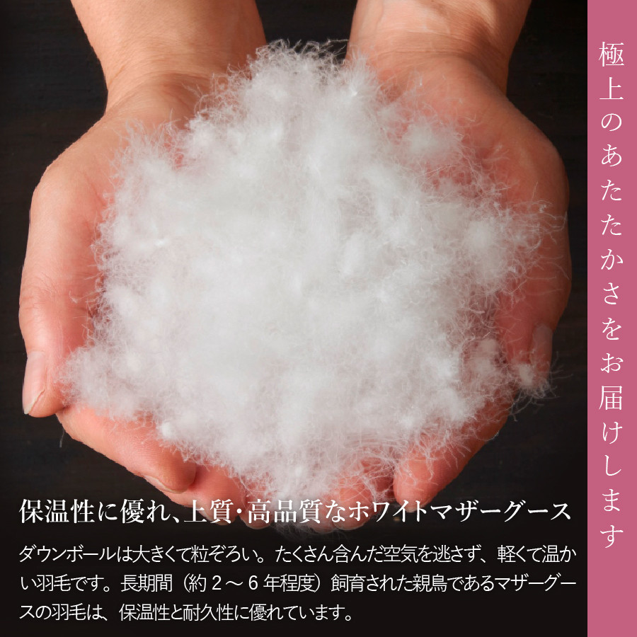 時間をかけて大切に育てられたマザーグースのダウンボールは大きくて粒ぞろい。たくさん含んだ空気を逃さないので軽くて温かい羽毛ふとんです。羽毛の温かさの目安となる「ダウンパワー」数値は440以上。