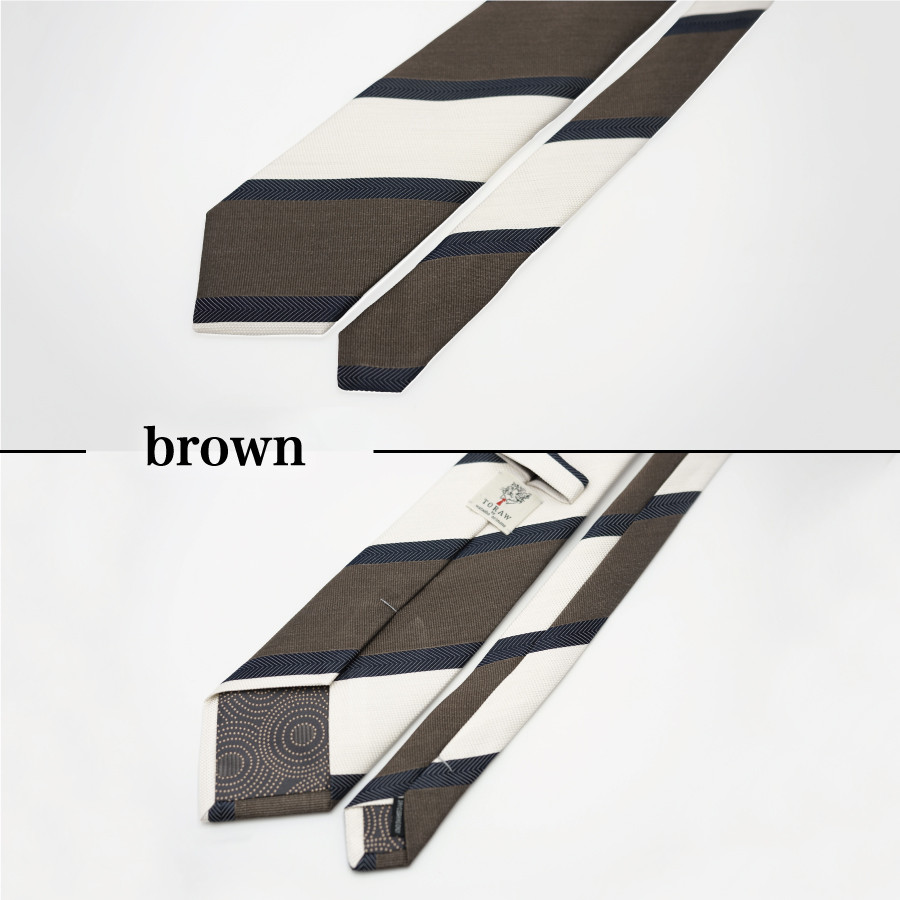 メッシュ調の軽やかな組織とオーセンティックなレップ組織を2段に合わせ、間にヘリンボーンのすっきりしたライン組み込んだTORAW037 ストライプタイです。