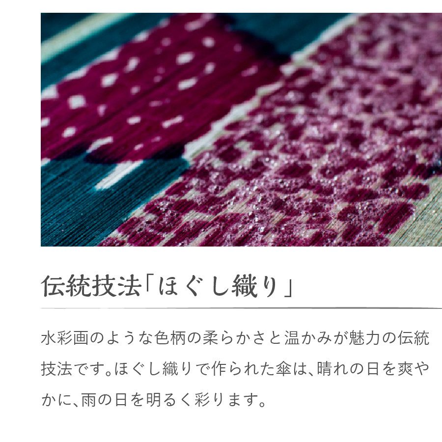 織物本来の価値をうみだすシャトル織機での織を大事にし、丁寧に織り上げました。 ■関連キーワード:日傘 レディース ほぐし織 UV加工 防水 撥水 麻100% 夏草 エンジ 母の日 プレゼント 誕生日 富士吉田市