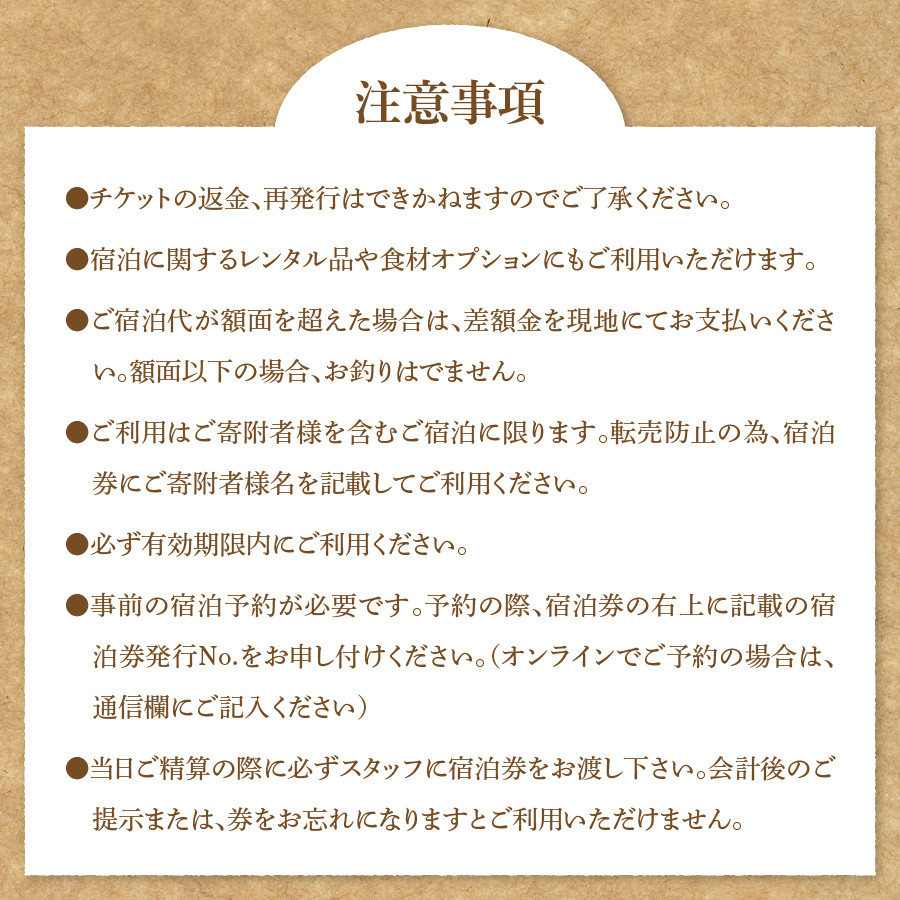 ・ご利用はご寄附者様を含むご宿泊に限ります。転売防止の為、宿泊券にご寄附者様名を記載してご利用ください。