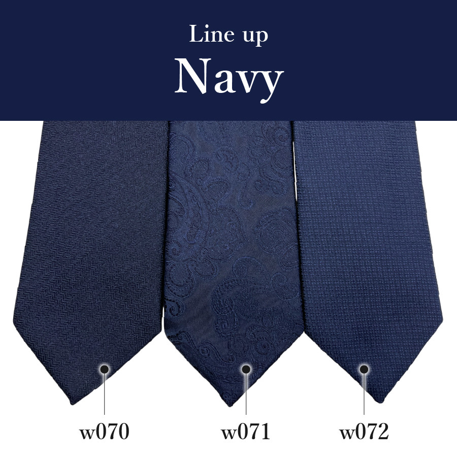 | 容量 | シルクネクタイ1本 ※デザインの品番をお選びください。 ■Navy w070 / w072 ■Blue w073 /w074/w075 全 長:145cm 大剣幅:8.5cm 素 材:シルク100% |