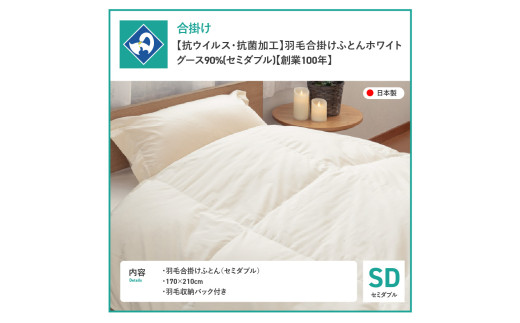 抗ウイルス・抗菌加工の生地と天然水で洗い上げた羽毛で贅沢な眠りをお楽しみください 【抗ウイルス・抗菌加工】羽毛合掛けふとんホワイトグース90%(セミダブル)【創業100年】 羽毛布団 寝具 合掛けふとん 抗菌 セミダブル 山梨 富士吉田