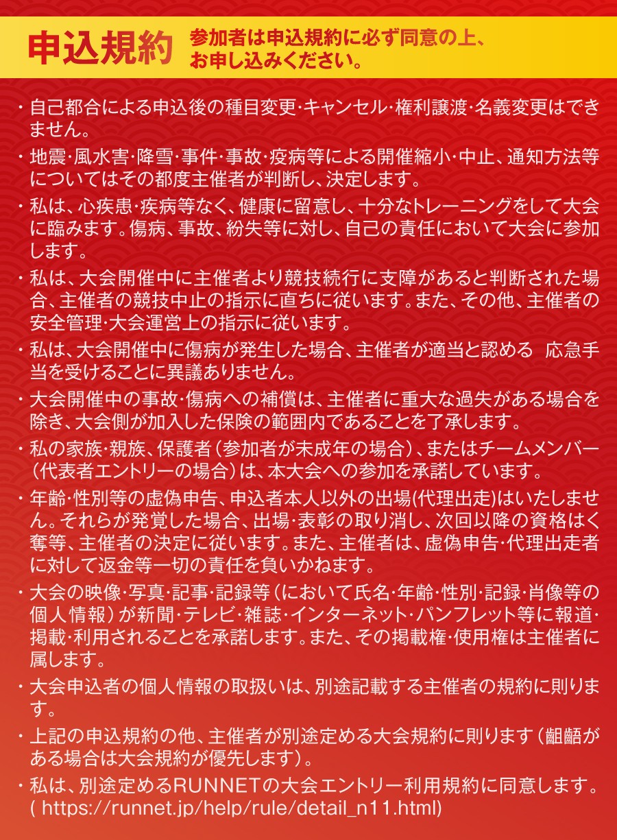 ・上記の申込規約の他、主催者が別途定める大会規約に則ります(齟齬がある場合は大会規約が優先します)。