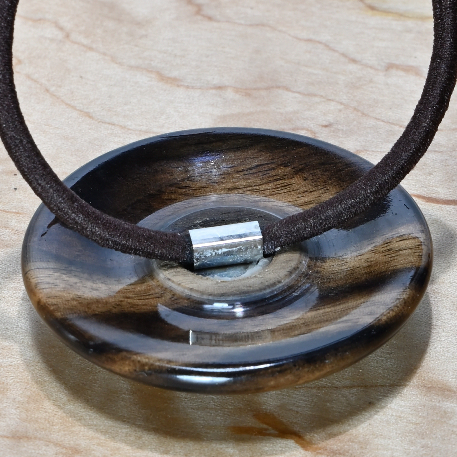 とっても珍しい黒柿のヘアーバンドです。丸い柄が一つ一つ違うイッピン物です 立木では黒柿の表情は見られません、伐採して模様が現れます。