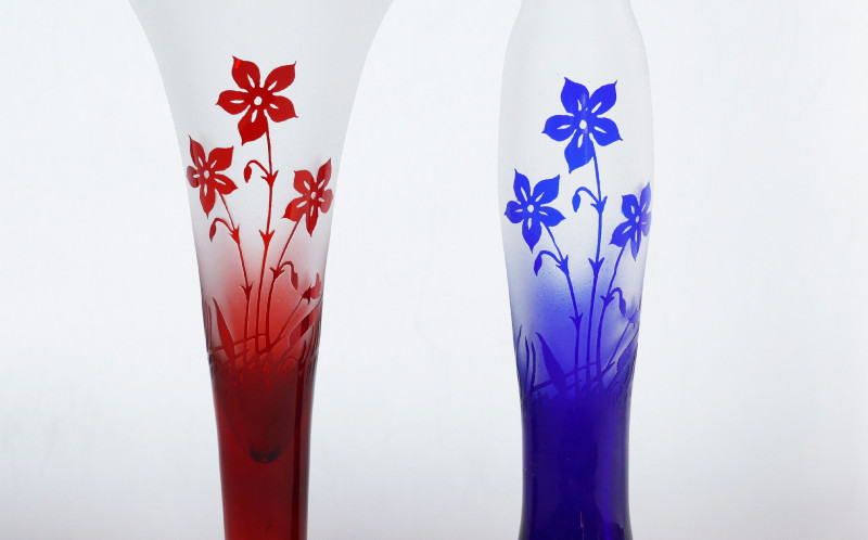 色被ガラスの伝統技法に最新のエッチング技法を駆使した美しい手作りガラス器 高級色被ガラス仕様の純日本調ガラス花瓶【デザイン=fancy-flower】2種5個セット