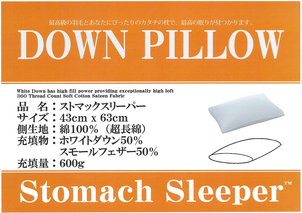 普通の枕はなんかしっくりこない。うつ伏せに眠るのが楽な方のために作った枕。 【羽毛枕】ストマックスリーパー ダウンピロー【定番サイズ:43cm×63cm】【サンモト】|うつ伏せ寝 ダウン 枕 まくら ダウン 羽毛枕 羽毛まくら ダウン枕 ダウンまくら サテン 綿100% 寝具 睡眠 快適 熟睡 快眠