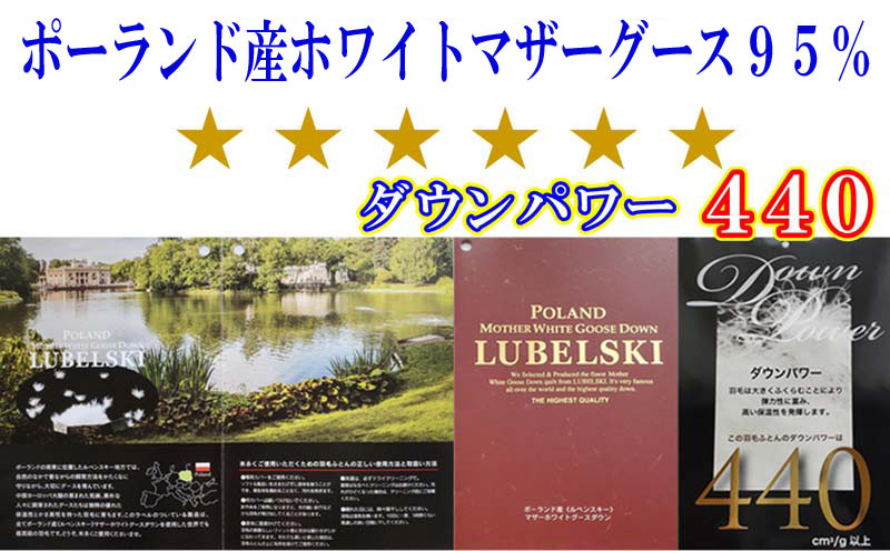 ポーランド南部に位置したルベンスキー地方の恵まれた気候で飼育されたマザーグースの羽毛は、ダウンパワー440cm3/gで、独特の優れた保温性とかさ高を持っています。