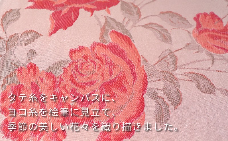 たて糸をキャンバスに、よこ糸を絵筆にみたて、季節の花々を織り描きました。