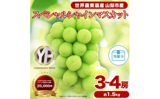 こちらは2026年度発送のお礼品となります。 地域ブランドYAMANASHI PRIDE【スペシャル】 1.5kgを2箱セットでお届けします。 ぶどうの中で1番人気を誇る「シャインマスカット」。 スペシャルランクは、糖度高いの甘いぶどうだけを厳選しお届けします。採れたてをすぐに出荷するため、旬の味わいを楽しめる製品です。 ぶどう栽培に適した豊かな自然環境と、長年培われてきた栽培技術から生まれる特別な一品です。 酸味の少ない濃厚な甘みは、1度食べ始めると癖になってしまうこと間違いなし!種はなく皮ごと美味しく食べることができます。 マスカットの芳醇な香りと爽やかな甘さをお楽しみください。 日持ちも良いので、大切な方への贈りものとしてもおすすめです。 【YAMANASHI PRIDEプレミアムとは・・】 ““““山梨の誇りを届ける““““を合い言葉に、土地、生産者、消費者、未来の4方向が幸せになる製品のみを厳選した地域ブランドです。味や品質の良さは勿論のこと、売り上げを通して山梨の生業や美しい景色を応援できる製品です。 ■生産者の声 ブドウの名産地、山梨市で丁寧に育てた葡萄の中から厳選した製品をお届けします。 本製品の収益の一部は、未来のぶどう産業を担う若手農家の育成に活用します。長年のぶどう栽培で身につけた技術だからこそ実現できる山梨の誇りの味をお楽しみください。