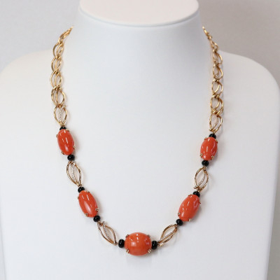珊瑚のやさしいオレンジとピンクゴールドにコントラストでブラックアゲートが入りエレガントで肌になじみやすく豪華でもありながら使い易いネックレスです。