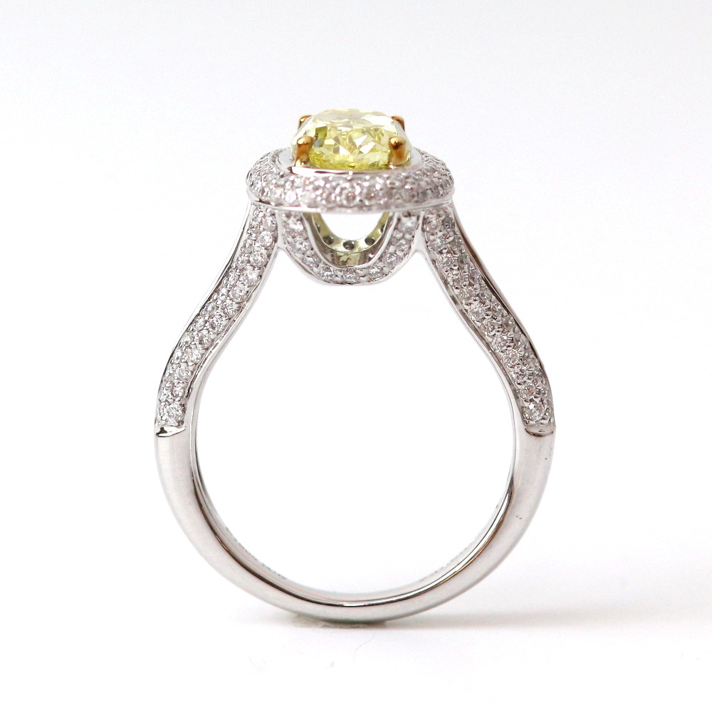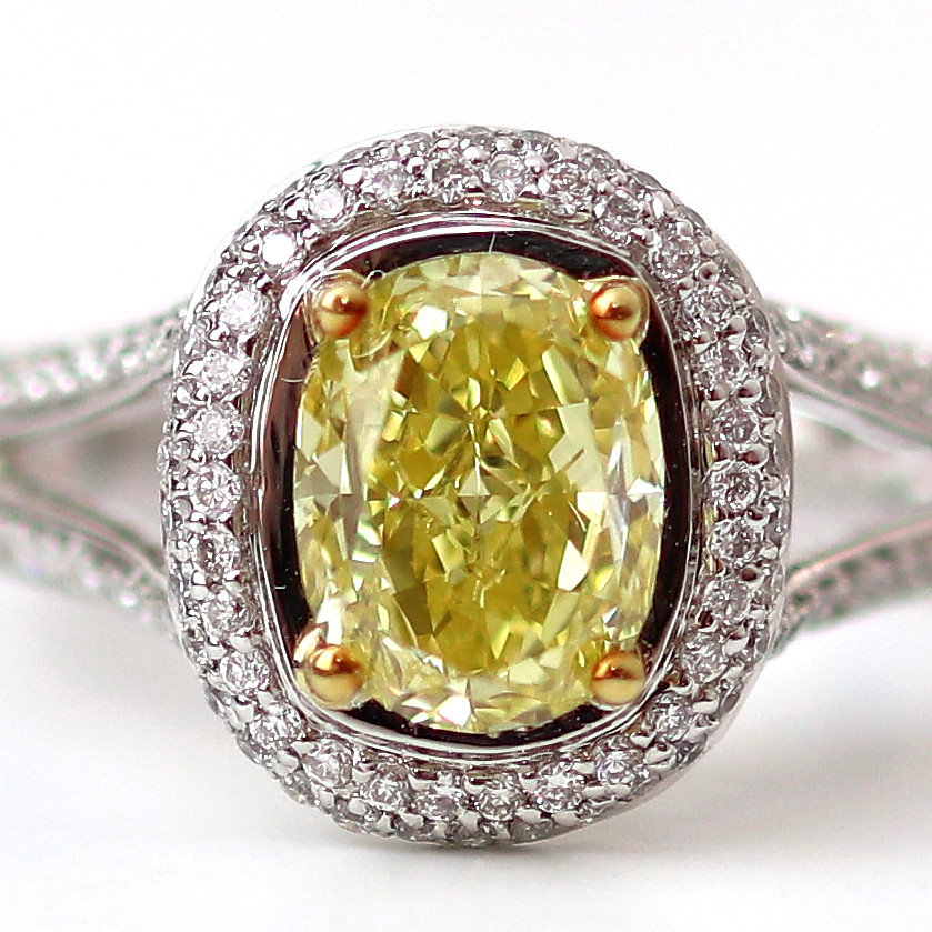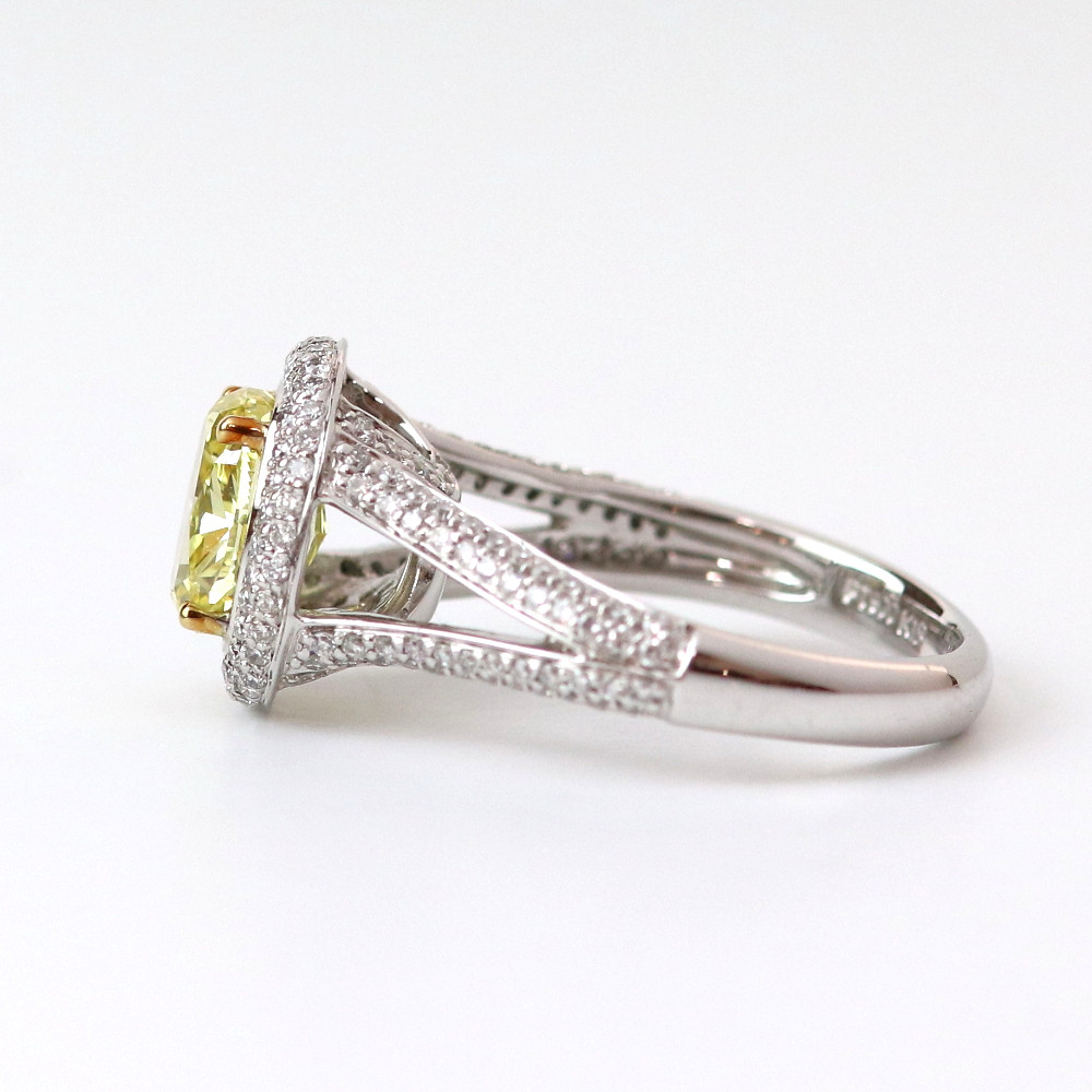2カラットのファンシーインテンスイエローダイヤモンド。テリも良く鮮やかなイエローダイヤモンド。中石を留める爪にK18を使いより石が綺麗に見えるようにデザインされています。・Pt900 ・K18・Fancy Intense Yellow 2.09ct GIA鑑別書 ・ダイヤモンド0.70ct ・刻印:Pt900 K18 2.09 0.70 サイズ#8~#15