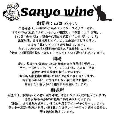 三洋醸造は、山梨県山梨市牧丘町にあるファミリーワイナリーです。創業以来、自社圃場産をメインとした山梨の葡萄を使い、本当の「日本ワイン」を作り続けています。社名の由来は、宋代の詩人蘇東坡が唱えた「三養訓」に由来し、「美味しい葡萄酒を飲んで楽しく生きよう」という思いが込められています。そんな三養醸造が贈るマスカットベーリーAとmakioka 赤2本セットを是非ご賞味ください。