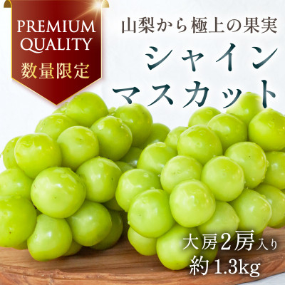 | 容量 | ■お礼品の内容について ・プレミアムシャインマスカット[大房2房 約1.3kg] 原産地:山梨県山梨市 ■注意事項/その他 ※天候や生育状況によりお届けが前後する場合がございます。記載の発送時期は目安となりますのでご了承ください。 ※生鮮品のため、賞味・消費期限は非常に短くなっております。到着後は状態をよくご確認のうえお早めにお召し上がりください。 ※デリケートな果実ですので、輸送中の揺れなどにより、房落ちなどが起こる場合があります。品質に問題ない範囲での房落ちについては何とぞご了承いただけますようよろしくお願いします。 ※粒の大きさは天候等により多少の変化がございます事をあらかじめご了承ください。 ※画像はイメージです。 ※長期不在等によりお受け取りいただけなかった場合の再送はいたしかねます。 ※お届け期間内に長期のご不在等がございましたら、お早めにサポートセンターへご連絡をお願いいたします。 ※返礼品のお届け日は指定できません。 |