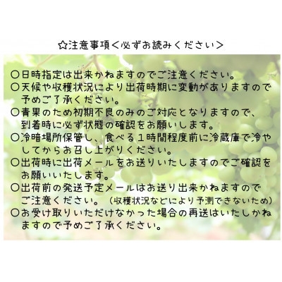 | 容量 | ■お礼品の内容について ・シャインマスカット[2.0kg (3~4房)] 原産地:山梨県 山梨市 ●OUTTA REACH JAPANとは? 全国屈指のぶどう生産地”山梨県”から【旬の時期に本場から本物のみをお届けする】事にこだわり、 厳選したお品のみを取り扱い、贈答用としても喜んで頂いております。 生産者が一年間手間暇かけ真心を込めて大切に作った”本物”のシャインマスカットを、 全国の方々に味わって頂きたいと思いを込めて生産・出荷しております。 ■注意事項/その他 【お申し込み前に必ずご確認ください】 ・天候や収穫状況により出荷時期が変動する場合がありますので、ご了承ください。 ・ぶどうの特性上、輸送中に粒が房から取れてしまうことがありますので、ご了承ください。 ・本返礼品は消費期限が短いため沖縄、離島へは配達いたしかねます。 ・配達日の指定はお受け出来ません。 ・お届け期間内に長期のご不在等がございましたら、お早めにサポートセンターへご連絡をお願いいたします。 ・長期不在などお受取人様の都合によりお届けが出来なかった場合、再送およびキャンセルはいたしかねます。 ・返送などによって、お礼の品の消費期限が過ぎた場合は、食品衛生上の都合により破棄させて頂きます。 ・粒の大きさは天候等により多少の変化がございます事をあらかじめご了承ください。 |