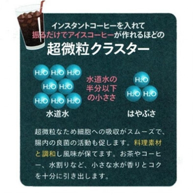 はやぶさ温泉水のクラスター値は50ヘルツで、他の水と比べて分子の房が比較的小さいことを示します。クラスター値が小さいため細胞に浸透しやすくなっております。