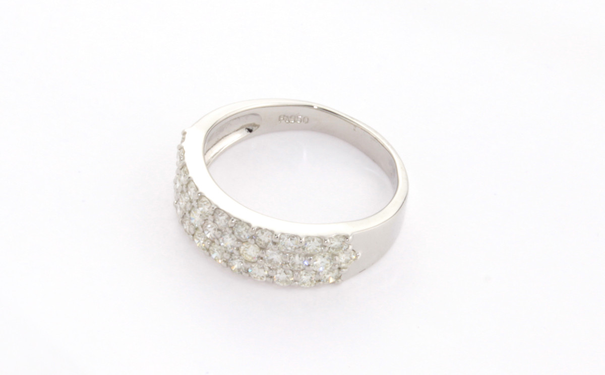 プラチナ950ハードプラチナを使用した1カラットのダイヤモンドリングです。34石ものダイヤモンドが石畳(パヴェ)状に敷き詰められ、一つひとつが光を反射して美しく煌きます。一つは持っていたいデザインの指輪ではないでしょうか?