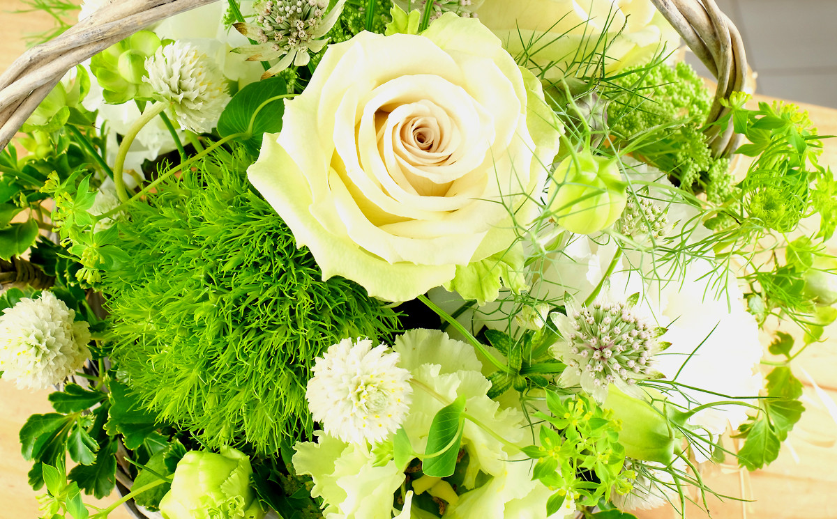 季節ごとにきれいに咲いている花を選んでアレンジいたしますので、お写真とは異なる場合がございます。