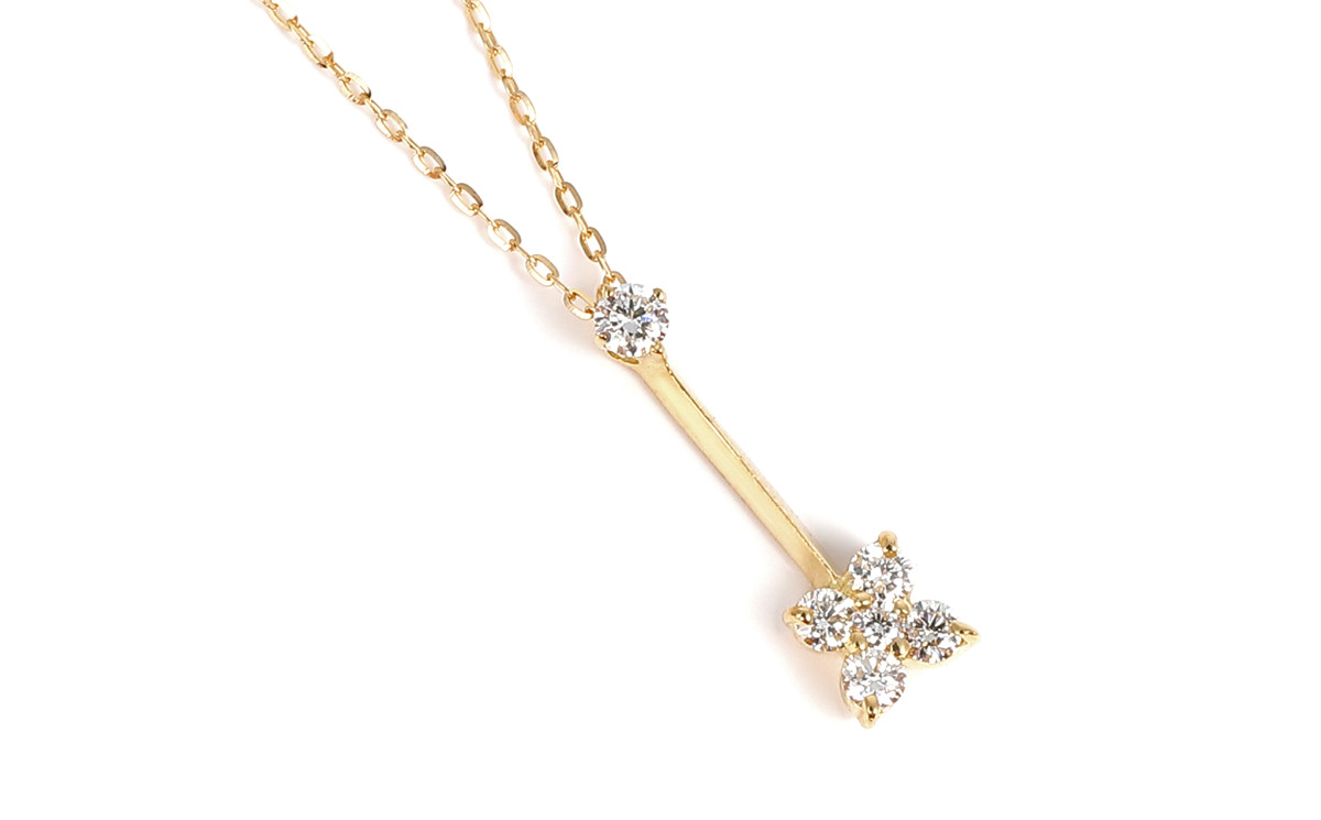 ぶら下がりタイプのK18ダイヤモンドペンダントになります、ダイヤモンドの一つ石の下に、クローバーの花びらが揺れる形になります。ぶら下がりタイプのペンダントは実際にお付け頂いた際に首元にY字ラインが綺麗に出て、胸元をスッキリと見せてくれると思います。