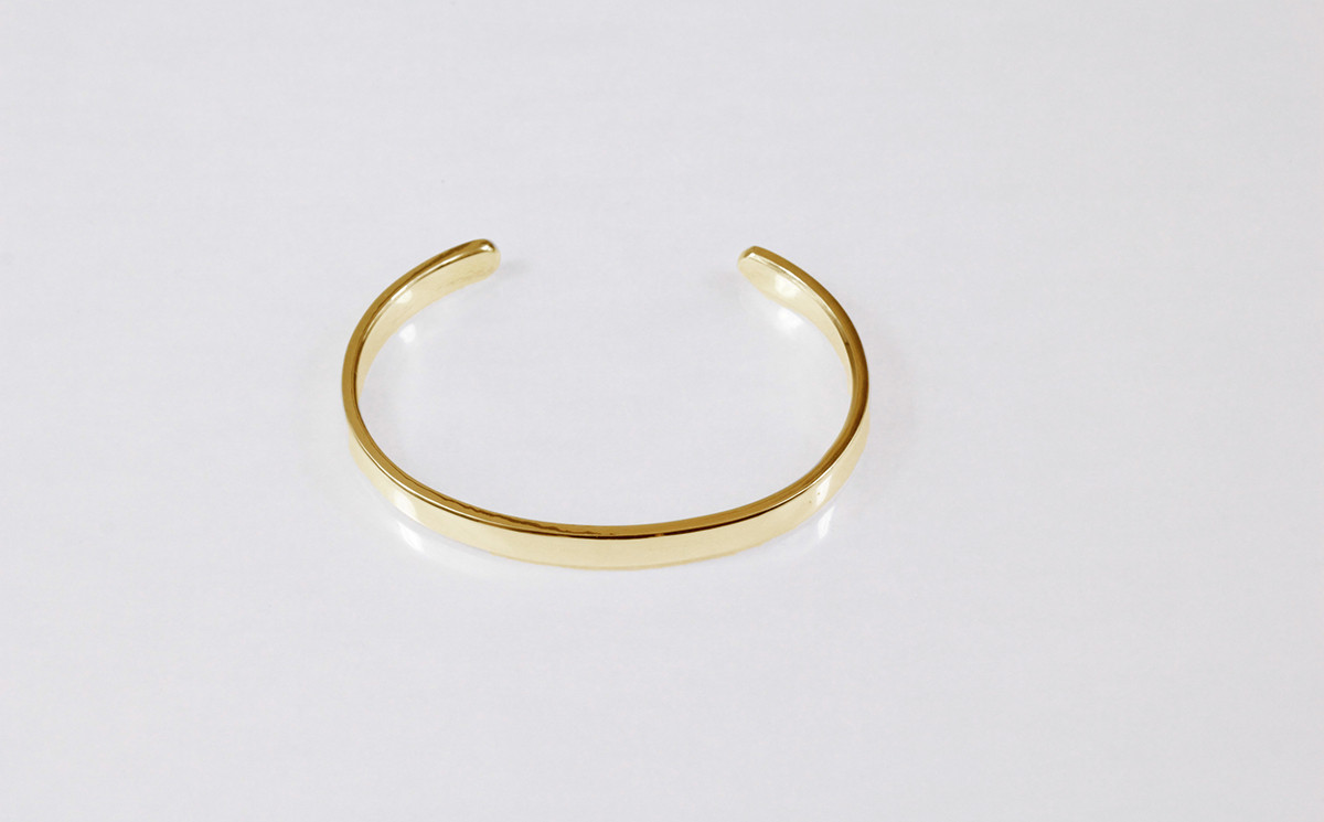 一般的なバングルより厚めに製作しています。地金厚は2.3mm前後です。2.5mm厚のk18板をもとに作る為、大きさにより厚さに誤差が生じますのでご了承ください。また、同じ重量の18金を使用して製作しますので、XS~XLは全て同じ位の重量です。