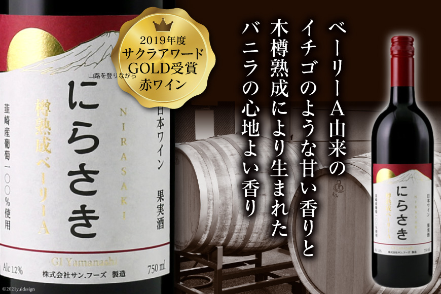 2019年度サクラアワードGOLD受賞赤ワイン ワイン 『にらさきワイン』 赤 750ml 1本 樽熟成 ベーリーA 赤ワイン お酒 酒 洋酒 アルコール 熟成 晩酌 日本ワイン 2019年 サクラアワードGOLD受賞 送料無料 [サン.フーズ 山梨県 韮崎市 20743340]
