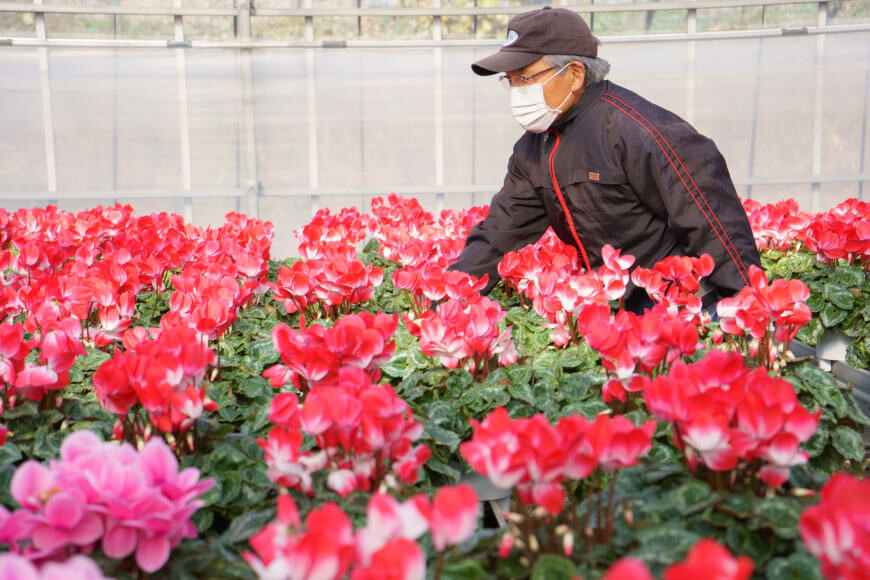 多くのシクラメンを観て触れてきた経験を活かし、丈夫で長持ちする物にこだわり試行錯誤を重ね、今も「長持ちするシクラメン作り」をテーマに取り組んでいます。