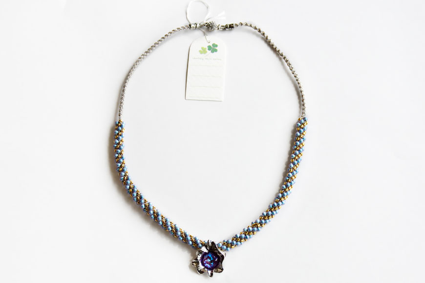 グレーの絹糸コード紐に、スワロフスキーのライトブルーのパールとゴールドのビーズを組み入れて、特注品のペンダントトップをつけた組紐金剛組ネックレスです。