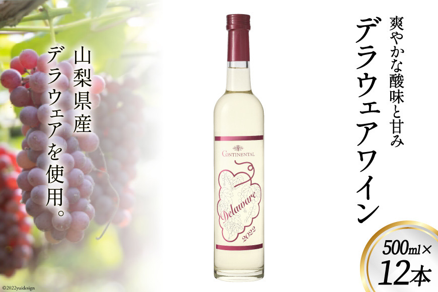 山梨県で収穫されたデラウェア(デラウェア/ぶどう/葡萄)を100%使用した、果実味あふれる白ワインを500ml×12本セットでお届けします。