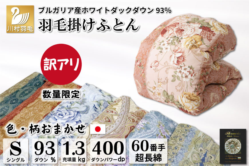 数量限定 高品質羽毛&良質コットン生地で暖かさ◎ 訳あり 羽毛布団 シングル 冬用 色柄おまかせ 掛け布団 冬 本掛け ブルガリア産 ホワイトダックダウン 93% 1.3kg 400dp 60番手サテン 布団 ふとん 羽毛ふとん 掛布団 日本製 数量限定 羽毛掛け布団 羽毛 寝具 ダウン ダウンケット [川村羽毛 山梨県 韮崎市 20743596]