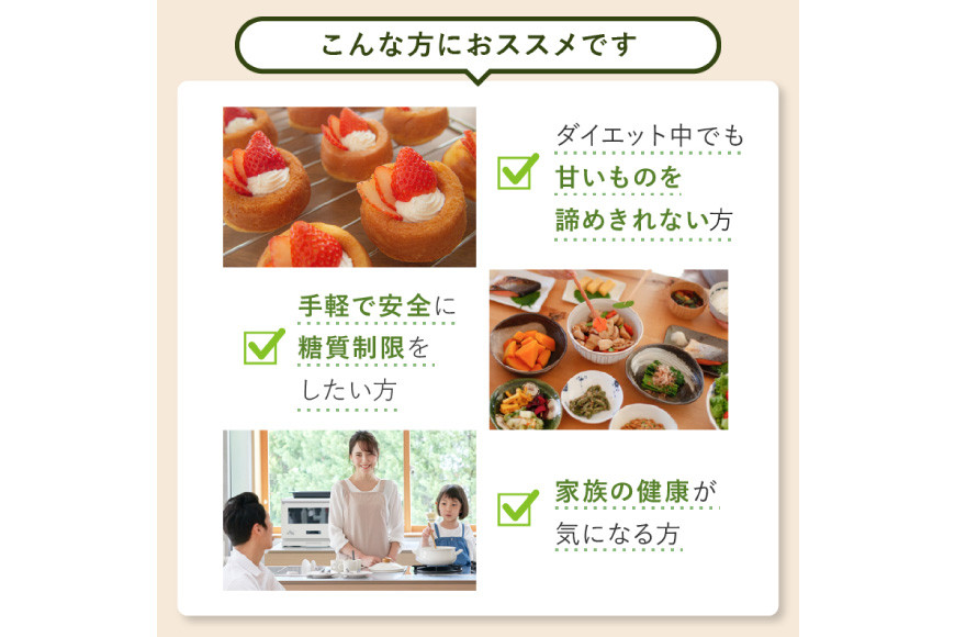 砂糖に似たまろやかな甘みのため少量で美味しく仕上がり、甘味料が初めての方、ダイエット、糖質を制限中の方でも違和感なくご使用いただけます。